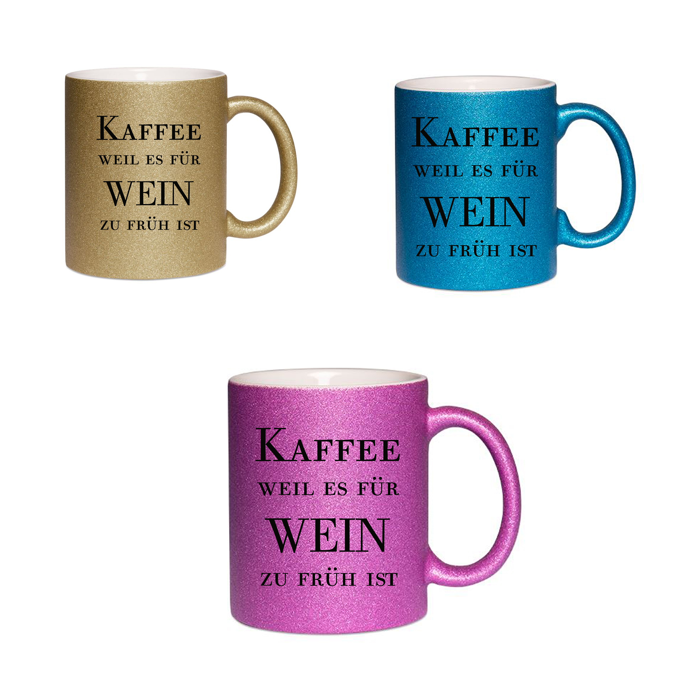 Glitzertasse in verschiedenen Farben mit Spruch “Kaffe weil es für Wein noch zu Früh ist”